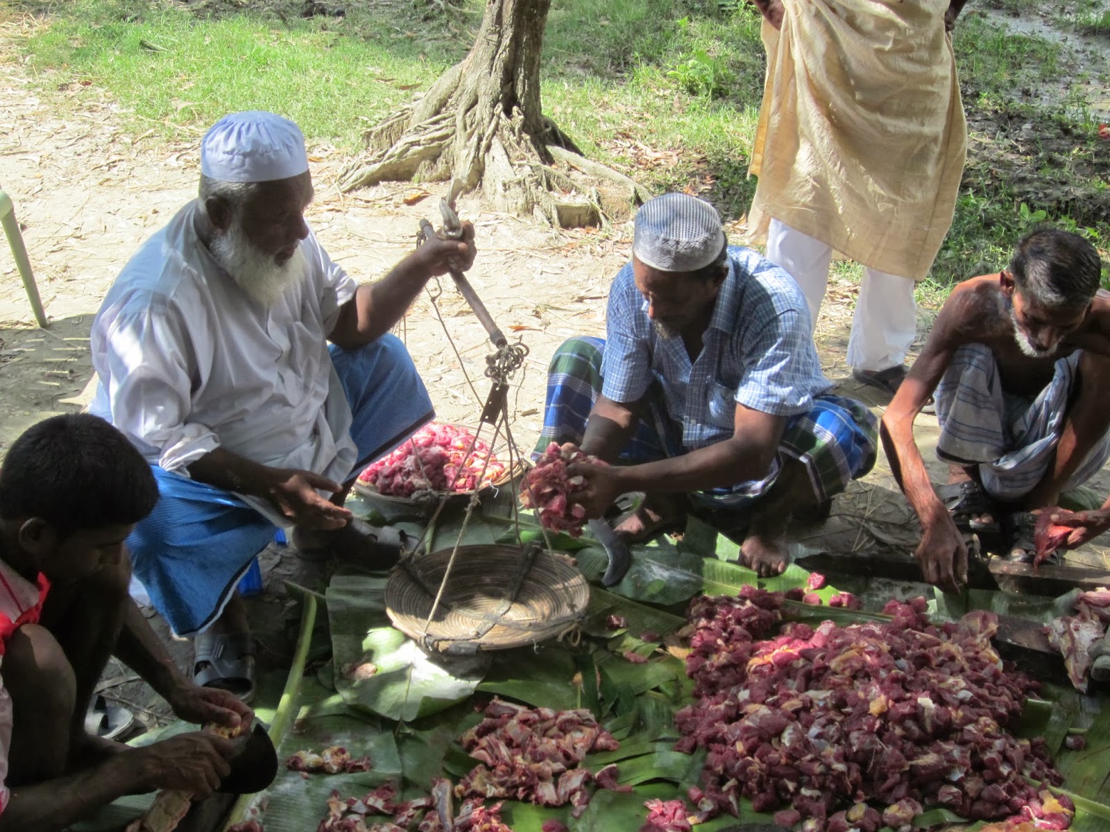 | Khair Kaka (Uncle) holds the scales while our householders divide the beef . It's an Eid al-Adha tradition. |